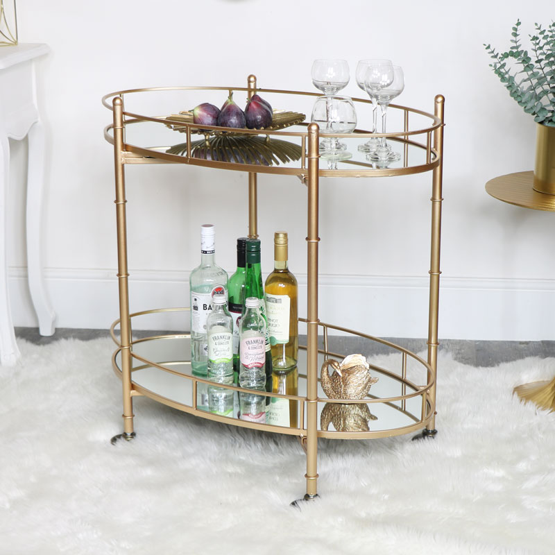There are kitchen carts with drawers and cabinets for spacious yet compact carts, the options are endless. Champagne gold or matt black finish metal frame. H deluxe gold metal oval mirrored bar cart crafted according to the highest standards crafted according to the highest standards from tempered glass and iron, this deluxe bar cart is the perfect accessory for entertaining. This bar cart boasts a compact footprint for versatile placement options. Entertain guests like a pro with this glitzhome mirrored bar cart. High and low shelves sit as chords spanning the circular frame. Boasting 2 tiers of antiqued mirrored shelves, its bold distressed gold finish, casters, elegant handle, and unique circular design are ideal for making the rounds. It can also showcase 3 of your favor wine glasses with the wine glass holders. This versatile furniture piece can double as a kitchen coffee cart, dining storage, or end table to make it both sensible and luxurious. Sure to impress your guests. Designed with a radiant gold finish and mirrored layers, it instantly upgrades any room. Odeon bar cart, seneca gold leaf/antique mirror $2,745.00. Target / furniture / kitchen & dining furniture / mirror :
